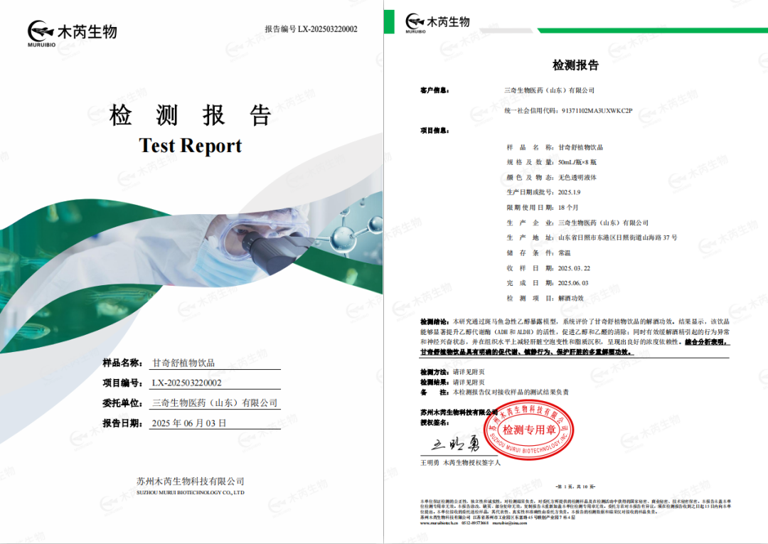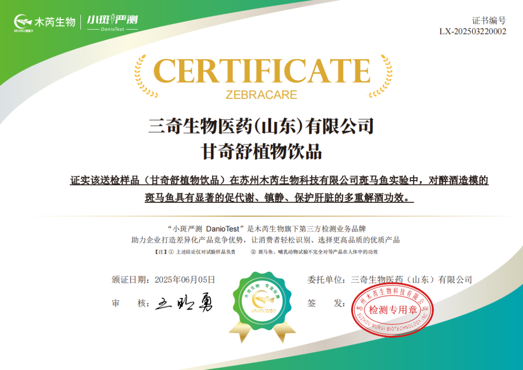 三奇生物医药最新研发的甘奇舒植物饮品,正在用科学数据颠覆解酒市场——权威实验室斑马鱼检测报告揭示:这瓶50ml的液体,竟能同时激活三大解酒防御系统!