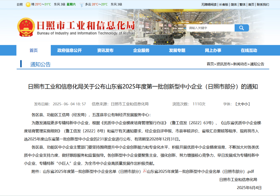 喜报频传! 6月4日,山东省工业和信息化厅正式发布2025年度第一批创新型中小企业名单,东港区表现抢眼,共有50家企业成功入选!其中,三奇生物医药(山东)有限公司作为生物医药领域的佼佼者,位列榜单第50位,展现了东港区企业创新活力的新高度。截至目前,东港区有效期内省级创新型中小企业总数达228家,较上年增长28%,区域创新动能持续增强。